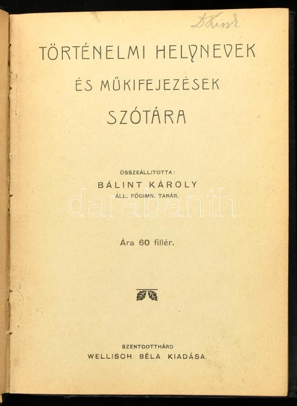 Történelmi helynevek és műkifejezések szótára. Összeállította: Bálint Károly. Szentgotthárd, é.n., Wellisch Béla, 173+4 p. Átkötött félvászon-kötés, kissé kopott borítóval, aláhúzásokkal.