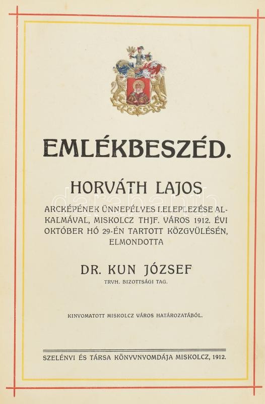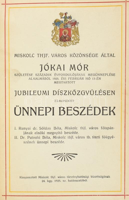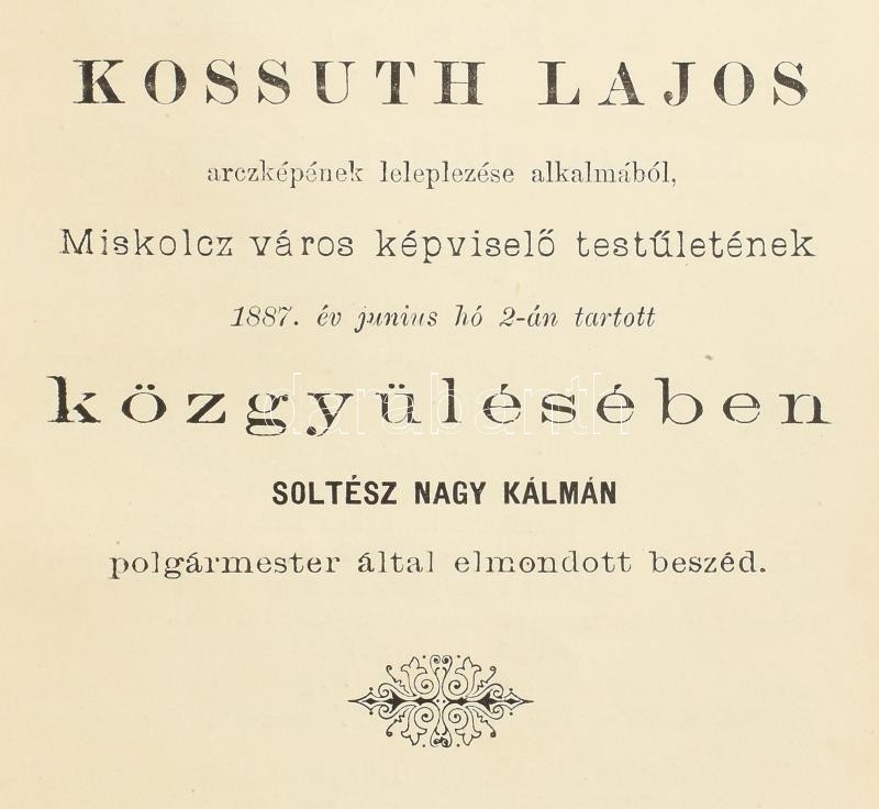 1873-1925 Kolligátum Miskolc város éves jelentéseiből és különféle beszédekből, egybekötve: 1873 Jelentés Miskolcz város hatósága és tisztviselői 1872-ik évi működésének eredményéről. Egyszersmind visszatekintés az önkormányzat ujraszületésétől felmerült nevezetesebb mozzanatokra. Ezekből kifolyólag indítvány Miskolcz köztörvényhatósággá leendő átalakulása tárgyában. Szerk. és előadta: Lossonczi Farkas Károly a város polgármestere. Miskolcz, 1873., Rácz Ádám-ny., 34+1 p. Megjelent 500 példányban.; 1880-1891 Miskolcz város polgármesterének és tiszti orvosainak jelentése az 1879./1883./1884./1886./1887./1888./1890. közigazgatási évről. Miskolcz, 1880-1891, Forster Rezső-ny., 36; 27; 27; 30; 30; 31; 36 p.; 1887 Kossuth Lajos arczképének leleplezése alkalmából, Miskolcz város képviselő testűletének 1887. év junius hó 2-án tartott közgyülésben Soltész Nagy Kálmán polgármester által elmondott beszéd. Miskolc, 1887, Falkenstein Adolf-ny., 4 p. [1887-1888. évi jelentések között.] 1912 Méltóságos Tekintetes ur! Tekintetes Törvényhatósági bizottság! Miskolc, én., Klein és Ludvig-ny., 30+2 p.; 1912 Kun József: Emlékbeszéd Horváth Lajos arcképének ünnepélyes leleplezése alkalmával, Miskolcz thjf. város 1912. évi október hó 29.-én tartott közgyűlésen, elmondotta. Miskolcz,1912., Szelényi és Társa-ny., 24 p.; 1925 Miskolc thjf. város közönsége által Jókai Mór születése századik évfordulójának megünneplésére alkalmából 1925. évi február hó 17-én megtartott jubileumi díszközgyűlésen elmondott ünnepi beszédek. I. Runyai dr. Sóldos Béla, Miskolc thjf. város főispánjának elnöki megnyitó beszéde. II. DR. Putnoki Béla, Miskolc thjf. város tb. tiszti főügyészének ünnepi beszéde. Miskolc, 1925, Klein, Ludvig és Szelény Rt-ny., 12 p. Későbbi átkötött kopott félvászon-kötés, ceruzás aláhúzásokkal, bejelölésekkel.