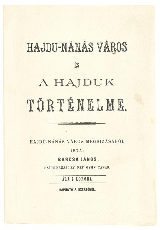 Barcsa János: Hajdu-nánás város és a hajduk történelme. Hajdúnánás, 1989.,Hajdúnánási Városi Tanács V.B. Hasonmás kiadás. Nyakas Miklós: Gondolatok Barcsa János Hajdu-nánás város és a hajduk történelme című munkájához c. melléklet. Kiadói papírkötésben. Megjelent 1000 példányban.