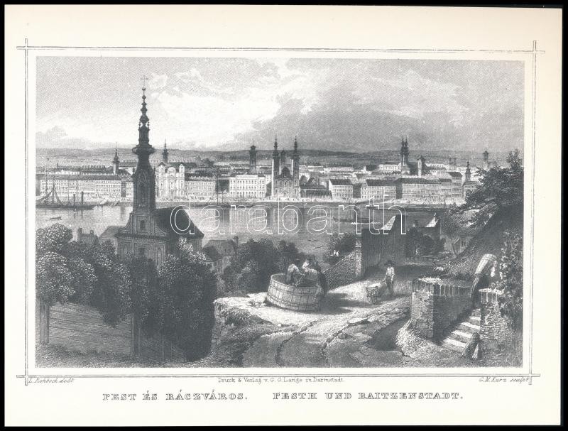Leírás: Buda és Pest 1856. L. Rohbock 16 metszete. Bp., Múzsák Közművelődési Kiadó. Kiadói papírmappában, javított gerinccel.