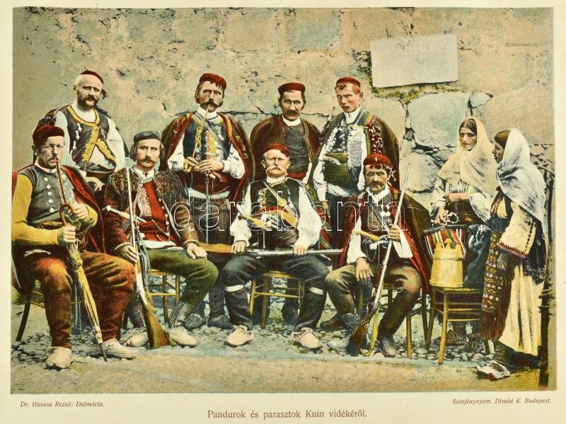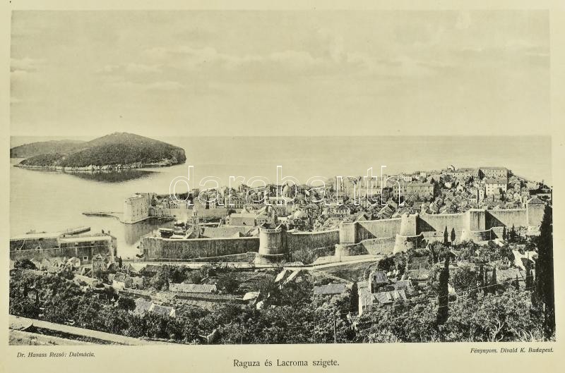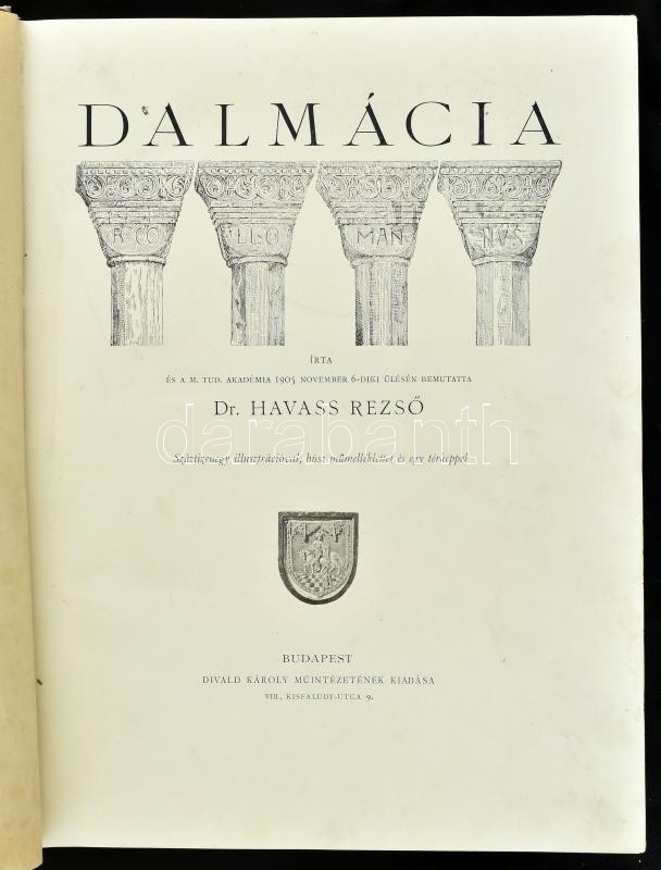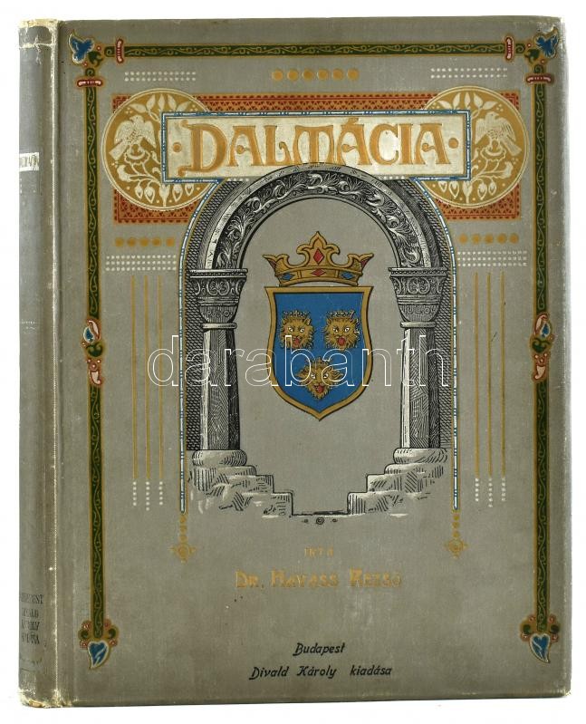 Dr. Havass Rezső: Dalmácia. Bp.,[1906],Divald Károly, (Stephaneum Nyomda Rt.), 130 p.+20 t.+ 1 t. (Divald K. fényképnyomatai, ebből 8 színezett, 1 térk., színezett). Kiadói aranyozott, festett, egészvászon-kötés, Gottermayer-kötés, kis kopásnyomokkal a borítón./Havass,Rezső: Dalmatia. Bp., 1906, Károly Divald. Gilt, and painted linen-binding, with little bit worn cover.