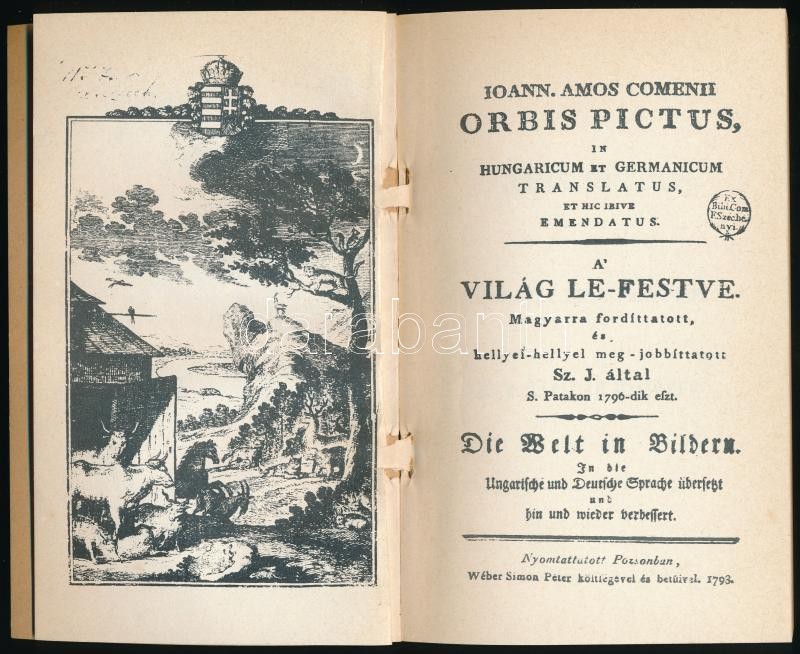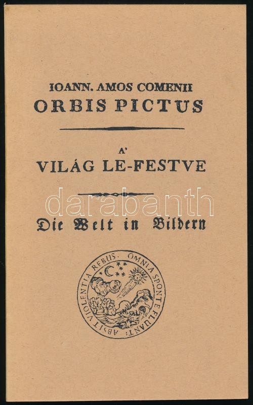 Johannes Amos Comenius: Orbis Pictus. A' világ le-festve. Die Welt in Bildern. Bibliotheca Comeniana I. Sárospatak-Miskolc, 1986, Magyar Comenius Társaság-Sárospataki Comenius TanÃtóképzÅ‘ FÅ‘iskola- Borsod-Abaúj-Zemplén Megyei Levéltár. Hasonmás kiadás. Magyar, latin és német nyelven. Megjelent 2000 példányban. Kiadói papÃrkötés, jó állapotban.
