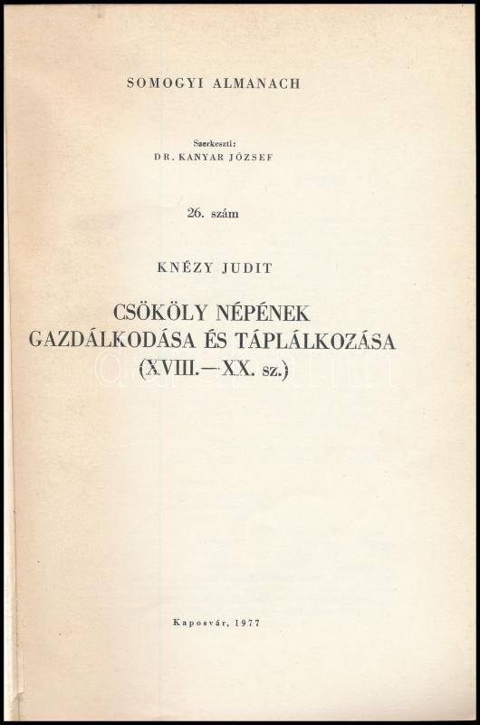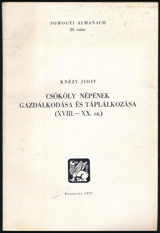 Knézy Judit: Csököly népének gazdálkodása és táplálkozása. (XVIII-XIX. sz.) Somogyi Almanach 26. Kaposvár, 1977., Somogy m. Nyomdaipari Vállalat, 91+1 p. Kiadói papírkötés, a 4. oldal kis része nyomdahibás. Megjelent 700 példányban.