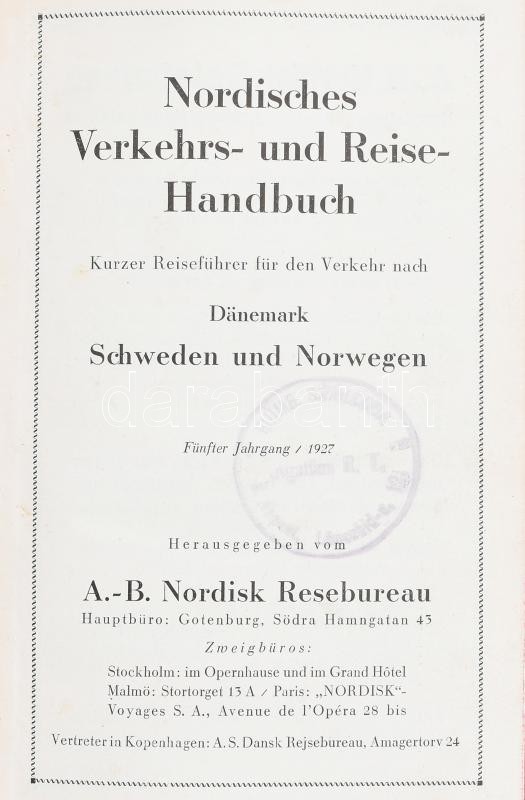 Nordisches Verkehrs- und Reise-Handbuch. Kurzer Reiseführer für den Verkehr nach Dänemark, Schweden und Norwegen. Fünfster Jahrgang. Gotenburg, 1927, A.-B. Nordisk Resebureau, (4)+254 p. + 1 t. (kihajtható térkép). Fekete-fehér képekkel illusztrálva. Német nyelven. Bordázott gerincű könyvkötői bőrkötés, az eredeti illusztrált papírborító bekötve, "Ingatlan Rt. Fiume Szálloda" bélyegzővel.
