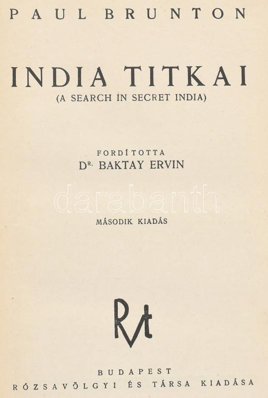 Paul Brunton: India titkai. (A search in secret India.) Ford.: Baktay Ervin. Bp.,én., Rózsavölgyi. Fekete-fehér fotókkal illusztrált. Kiadói egészvászon-kötésben, kopott, kissé foltos, gerinc mentén szakadozott.