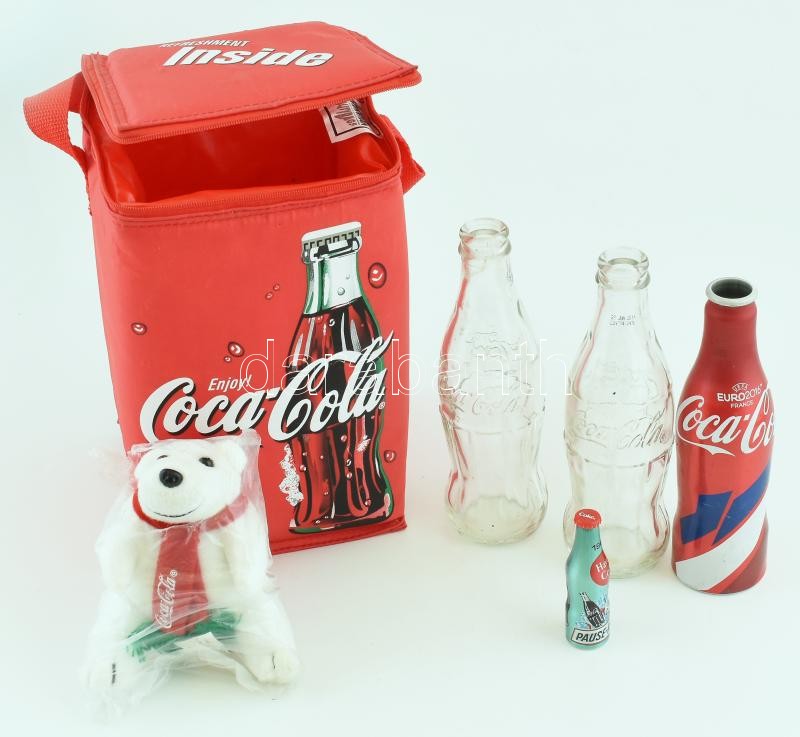Leírás: Coca-Cola tétel: hűtőtáska, 24x15x15 cm, benne plüss jegesmedve, 2 db üveg-, egy UEFA Euro 2016 és egy mini fém palack
