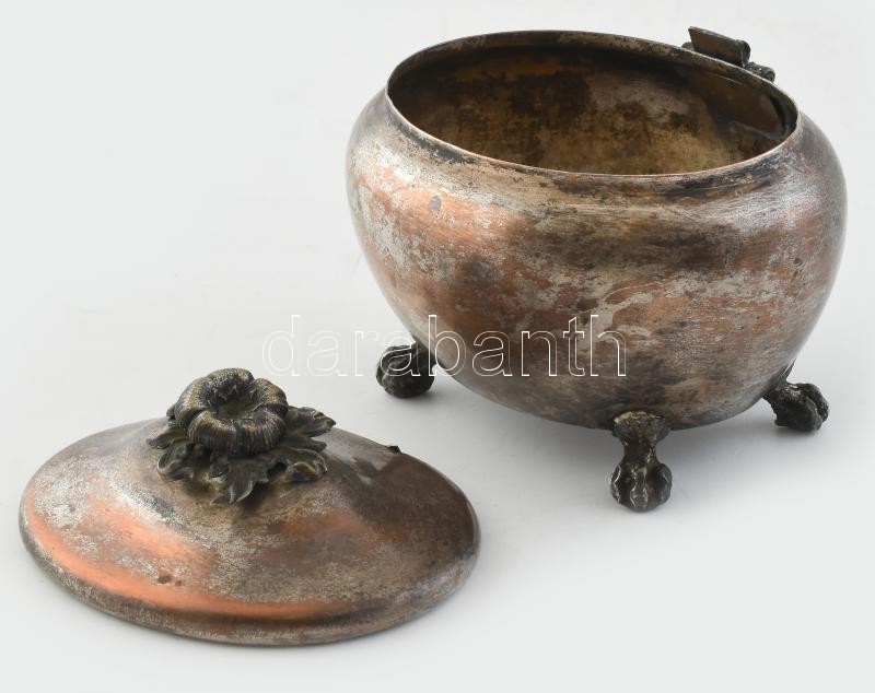 Leírás: Fém cukortartó doboz, kopott, jelzett, sérült, m:12cm