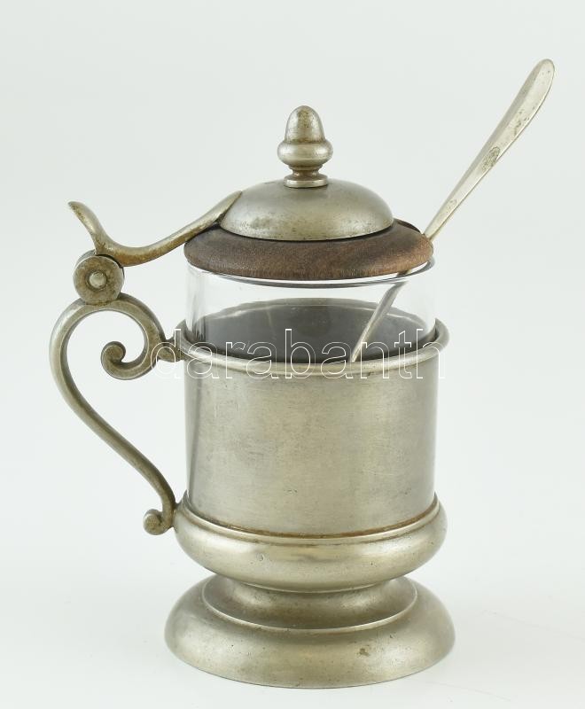 Leírás: Fém mustartartó, üvegbetéttel, fa rátéttel, kopott, jelzés nélkül, m:13cm