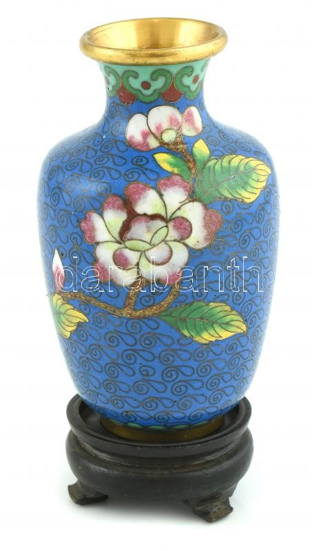 Leírás: Kínai rekeszzománc (cloisonne) kis váza, faragott fa talppal, apró kopásnyomokkal, m: 12 cm