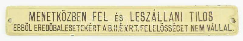 "Menetközben fel és leszállni tilos, ebből eredő balesetekért a B.H.É.V. R.T. felelősséget nem vállal.", régi, festett öntöttvas BHÉV tábla, kis lepattanásokkal, 30,5x4 cm