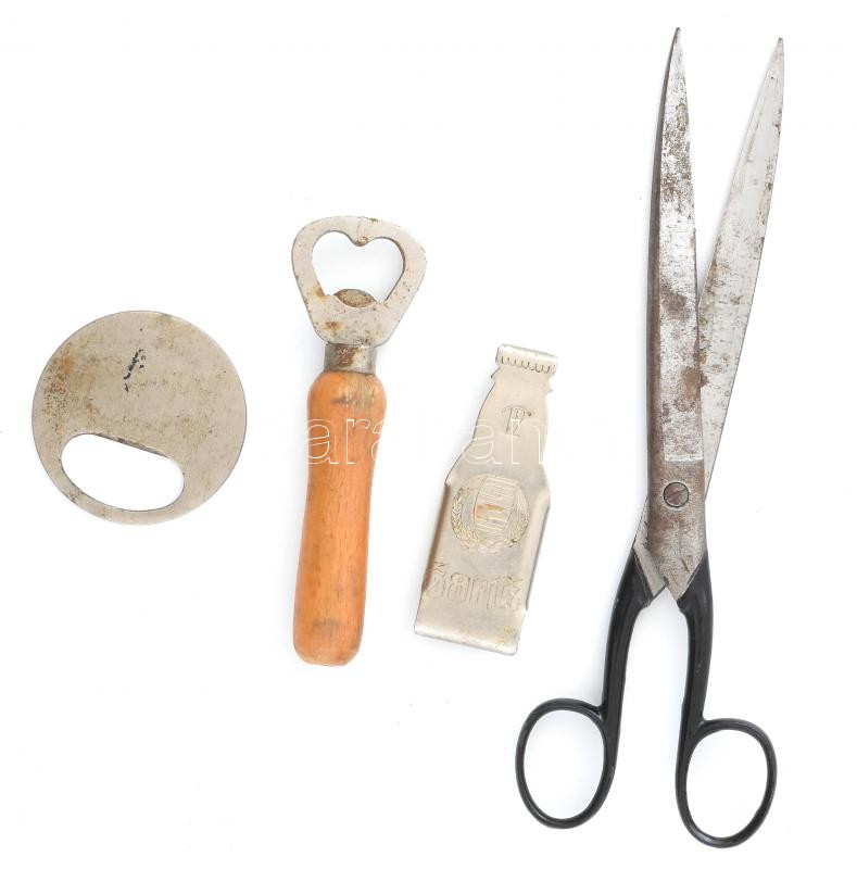 Leírás: Solingeni szabóolló, h: 23 cm + 3 db különféle sörnyitó. Kisebb rozsdafoltokkal.