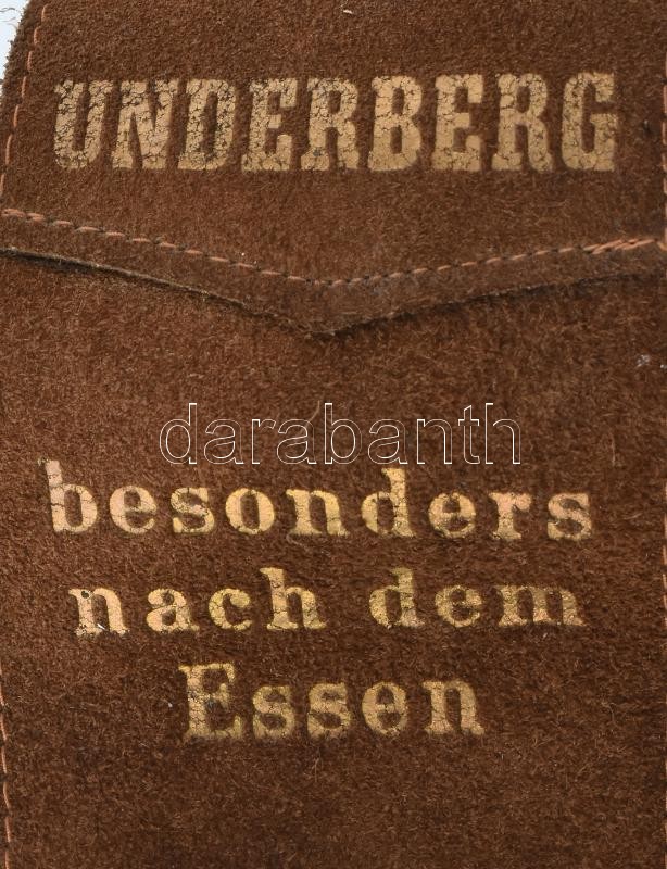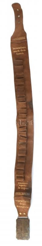Leírás: Underberg bőr öv, díszes réz csattal, likőrös üveg tartókkal, h: 103 cm