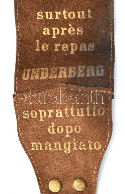 Underberg bőr öv, díszes réz csattal, likőrös üveg tartókkal, h: 103 c... https://www.darabanth.com/hu/409-Gyorsarveres/409.0/Mutargy-papirregiseg-egyeb/Bolhapiac~500012/Underberg-bor-ov-diszes-rez-csattal-likoros-uveg-tartokkal-h-103-cm~II2537818