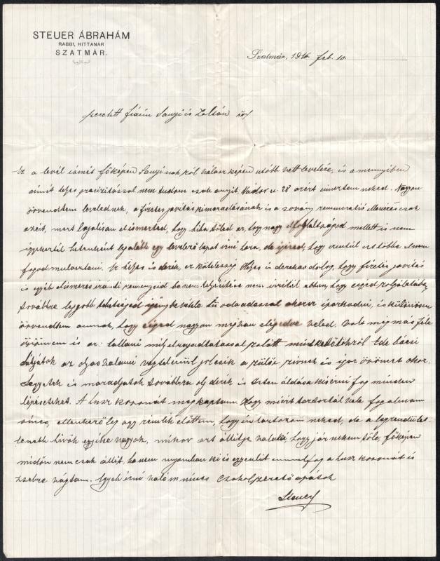 1916 Szatmár, Steuer Ábrahám rabbi, saját kezű levele fiának / Ábrahám... https://www.darabanth.com/hu/409-Gyorsarveres/409.0/Mutargy-papirregiseg-egyeb/Judaika~500025/1916-Szatmar-Steuer-Abraham-rabbi-sajat-kezu-levele-fianak-Abraham-Steuer-rabbis-letter~II2543534