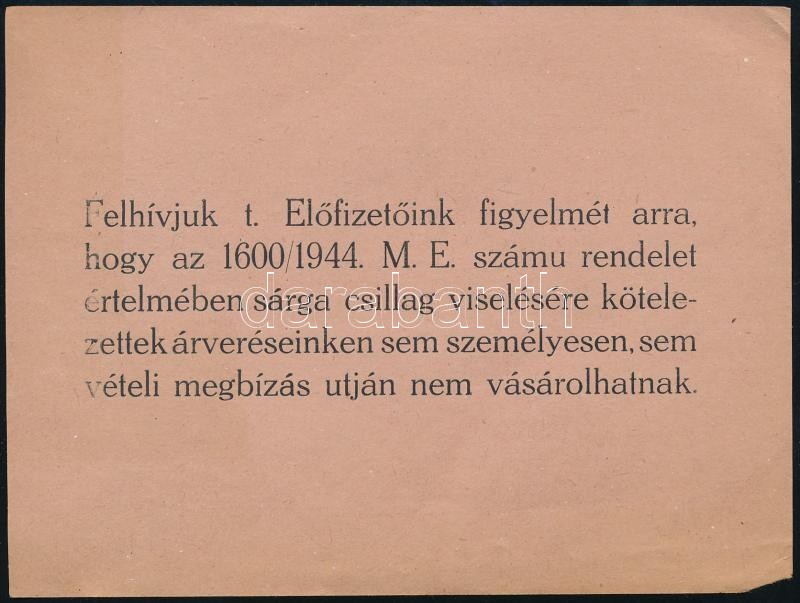 Leírás: 1944 Felhívás előfizetőkhöz, hogy a sárga csillagot viselők árverésen nem vásárolhatnak