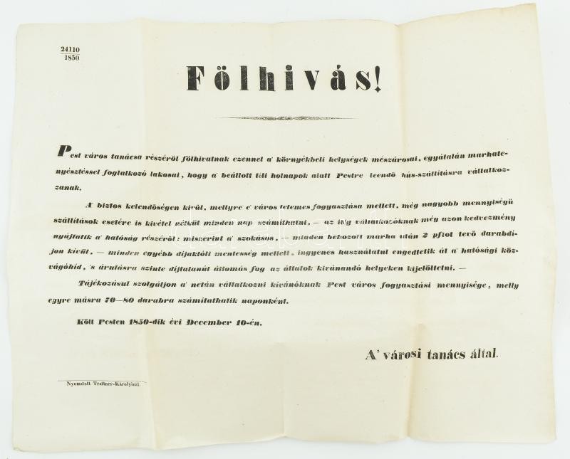 1850 Pest város hirdetménye mészárosoknak, marha kereskedőknek,hogy hozzanak állatokat Pestre, kedvezményesen, a vágóhíd ingyenes használatával 50x42 cm