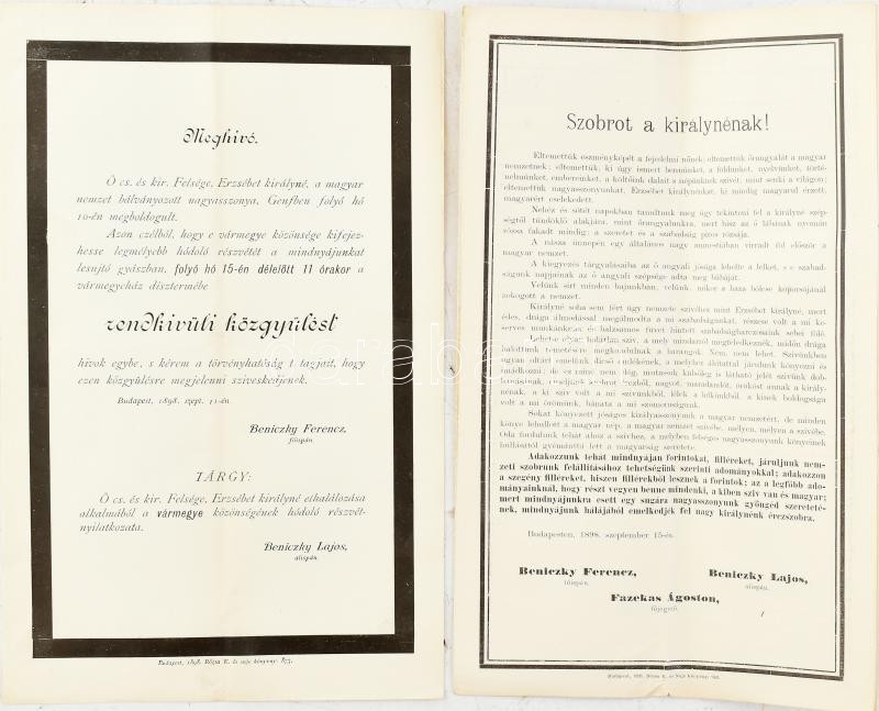 1898 Erzsébet királyné halálának alkalmából összehívott Pest vármegyei rendkívüli közgyűlés meghívója + hozzá a Szobrot a királynénak c. felhívás és gyűjtőív szép állapotban