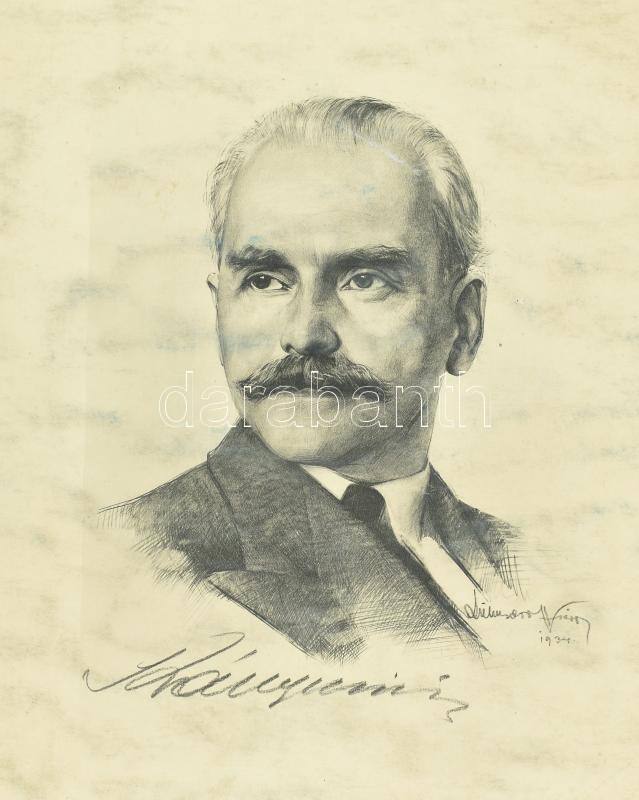 1934 Lühnsdorff Károly (1893-1958): Kállay miklós politikus, későbbi miniszterelnök portréja. Nyomat, papír, jelzett a nyomaton, ismeretlen autográf aláírással, kissé foltos és sérült, 70×50 cm