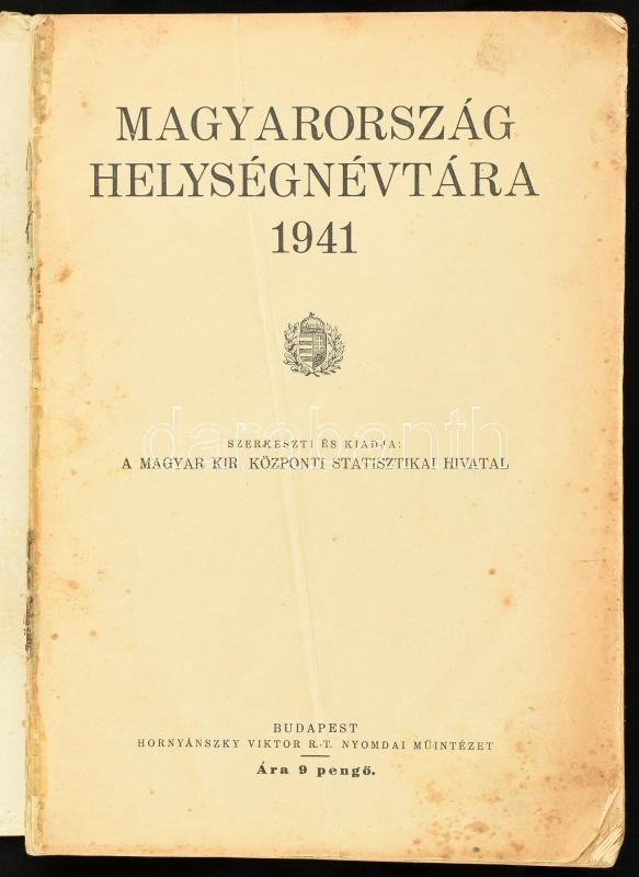 Magyarország helységnévtára 1941. Bp., Hornyánszky. Borító nélkül https://www.darabanth.com/hu/409-Gyorsarveres/409.0/Mutargy-papirregiseg-egyeb/Nyomtatvanyok~2000003/Magyarorszag-helysegnevtara-1941-Bp-Hornyanszky-Borito-nelkul~II2534832