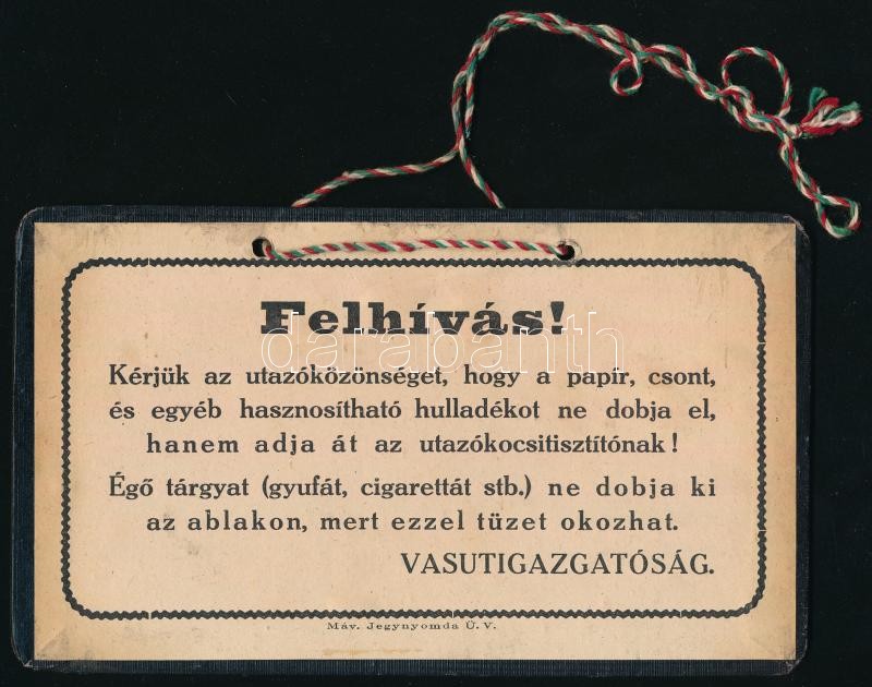 cca 1920-1940 Vasutigazgatóság felhívása az utazóközönséghez a hasznosítható és nem hasznosítható hulladék ügyében, Bp., MÁV Jegynyomda, kétoldalas kiakasztható nyomtatvány, kartontábla, 11x19 cm