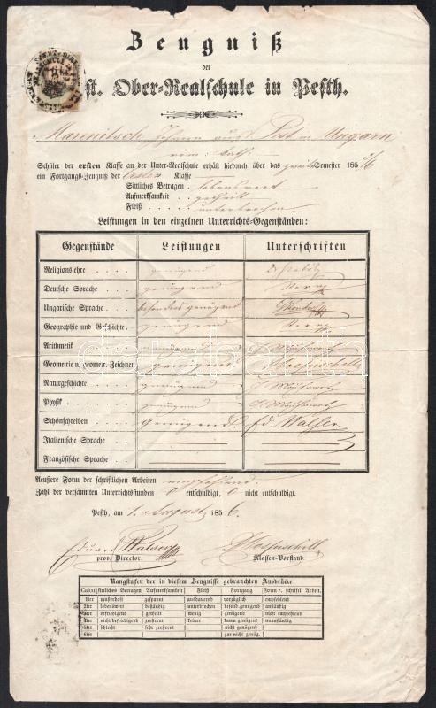 Leírás: 1856 Pest Ober Realschule bizonyítvány 15kr CM illetékbélyeggel