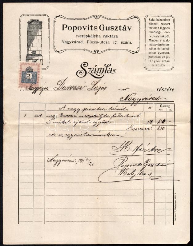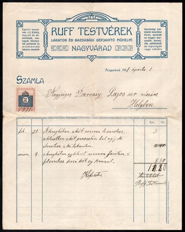 1911 Nagyvárad, 3 db fejléces számla (Ruff Testvérek, Popovits Gusztáv... https://www.darabanth.com/hu/409-Gyorsarveres/409.0/Mutargy-papirregiseg-egyeb/Okmanyok~500018/1911-Nagyvarad-3-db-fejleces-szamla-Ruff-Testverek-Popovits-Gusztav~II2537286