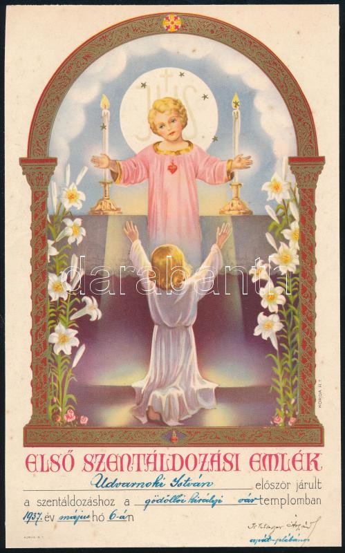 1937 Gödöllői királyi vártemplom, elsőáldozási emlék https://www.darabanth.com/hu/409-Gyorsarveres/409.0/Mutargy-papirregiseg-egyeb/Okmanyok~500018/1937-Godolloi-kiralyi-vartemplom-elsoaldozasi-emlek~II2534257
