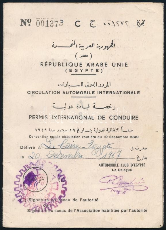 1967 Fényképes egyiptomi jogosítvány magyar személy részére https://www.darabanth.com/hu/409-Gyorsarveres/409.0/Mutargy-papirregiseg-egyeb/Okmanyok~500018/1967-Fenykepes-egyiptomi-jogositvany-magyar-szemely-reszere~II2537255