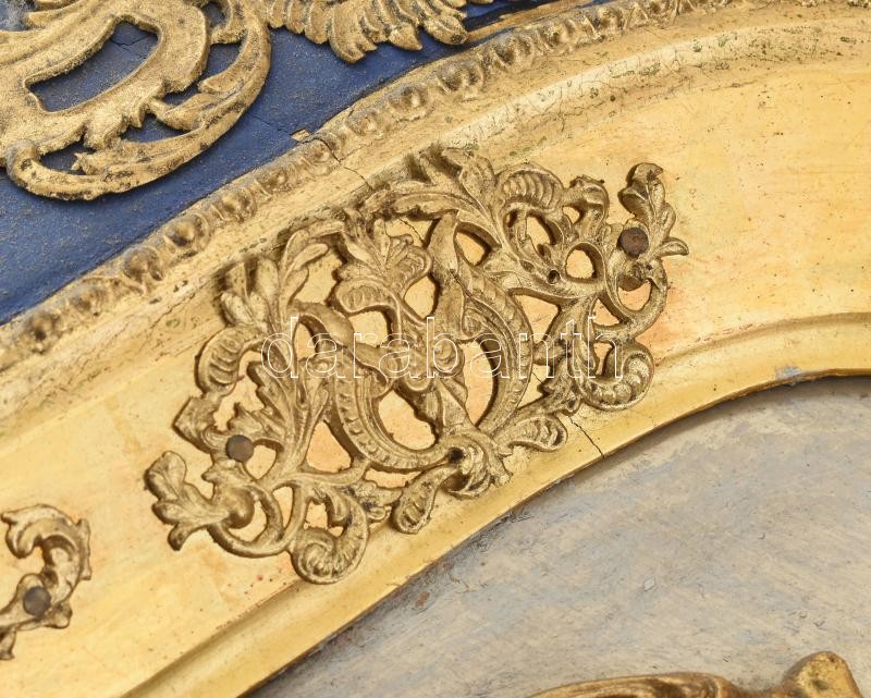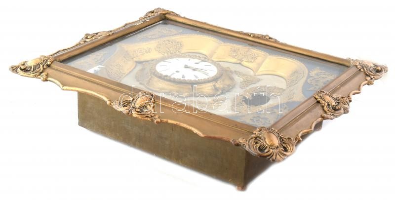 Leírás: Biedermeier keretóra, aranyozott hársfa keret, negyedütős szerkezettel, kopott, sérült, javításra szorul. 65x55x15cm