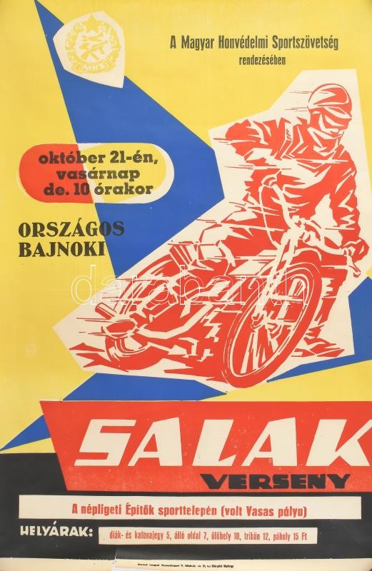 Magyar Honvédelmi Sportszövetség országos bajnoki salakverseny plakát,... https://www.darabanth.com/hu/409-Gyorsarveres/409.0/Mutargy-papirregiseg-egyeb/Plakat~2000004/Magyar-Honvedelmi-Sportszovetseg-orszagos-bajnoki-salakverseny-plakat-szakadassal-66C39744-cm~II2537772