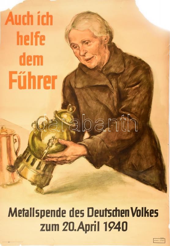 Paul Helwig-Strehl (1889-?): Auch ich helfe dem Führer. Metallspende des Deutschen Volkes zum 20. April 1940. Ofszet, papír. Carl Werner, Reichenbach nyomása. Náci propaganda plakát. Sérült, szakadt, hiányos, hajtásnyommal. 84x59 cm / Nazi propaganda poster. Offset on paper. Damaged. 84x59 cm
