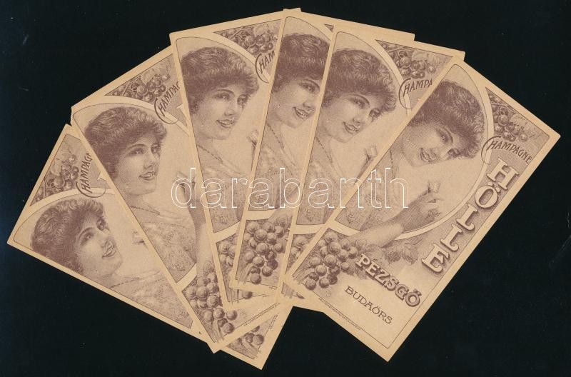 cca 1910 "Champagne Hölle Pezsgő Budaörs" számolócédulák 6 d... https://www.darabanth.com/hu/409-Gyorsarveres/409.0/Mutargy-papirregiseg-egyeb/Reklam~500022/cca-1910-Champagne-Holle-Pezsgo-Budaors-szamolocedulak-6-db-Bp-Kellner-es-Mohrluder-~II2542983