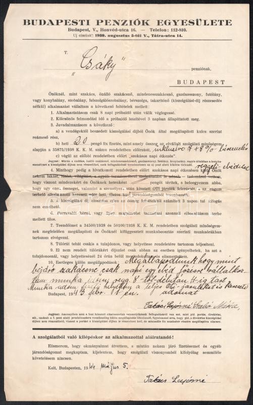 Leírás: 1944 Bp., Budapesti Penziók Egyesülete űrlap a Csáky penzió részére kiállítva