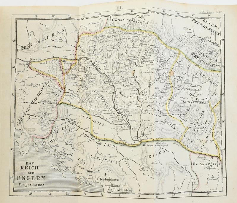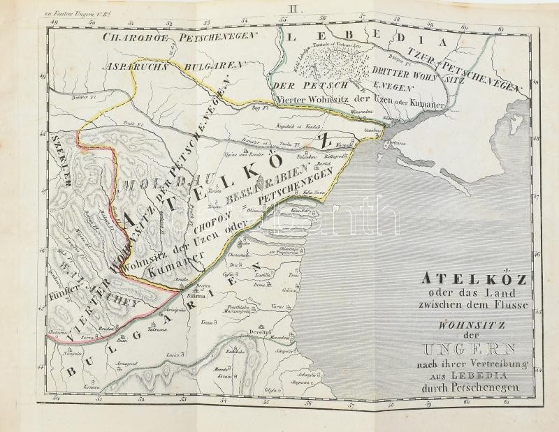 cca 1830 2db történelmi magyar térkép Atelköz, oder das Land zwischen dem Fluss Wohnsitz der Ungern nach ihrer Vertreibung aus Lebedia durch Petschenegen. + Das Reich der Ungern von 907 bis 1007. Határszínezett rézmetszetek. 23,5x17,5 cm , 23x17 cm