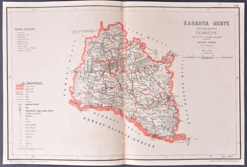 cca 1880 Baranya megye közigazgatási térképe, rajzolta: Hátsek Ignác, 1:500.000,[in: A magyar szent korona országainak megyei térképei, Bp., 1880.,] Rautmann Frigyes,(Posner-ny.), körbevágott, javított, 30x47 cm