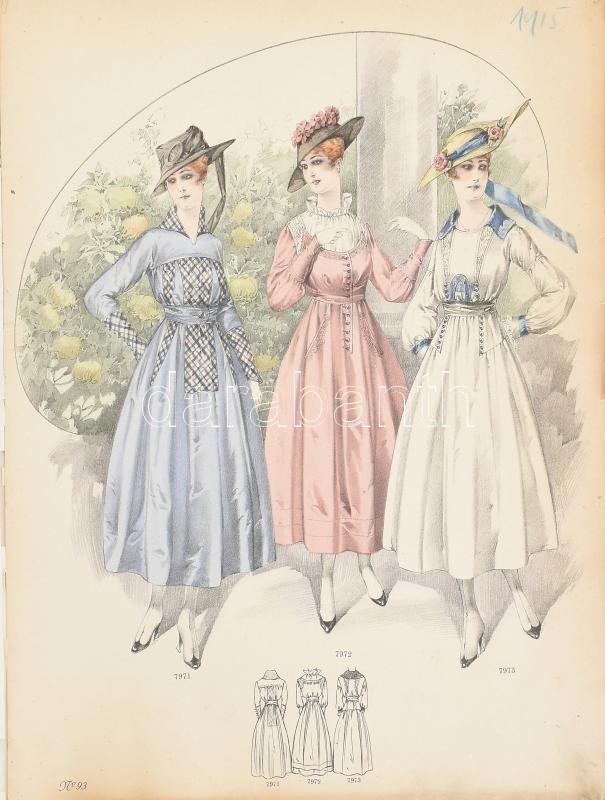 1901-1934 F. Dózsa Katalin (1942-2018) művészettörténész gyűjteményéből származó divattörténeti gyűjtemény az 1901-1934 évek divatjáról. Nyomatok litográfiák, újságkivágások, szabásminták, stb több száz darab, évenként megjelenítve korabeli félbőr kötésben.