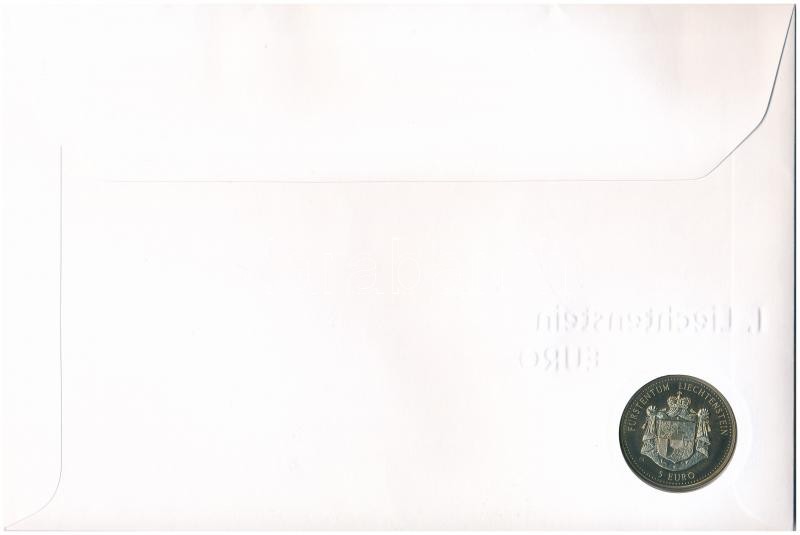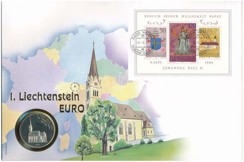 Liechtenstein 1996. 5E Cu-Ni "Szt. Flórián templom Vaduz", érmés borítékban, bélyeggel, bélyegzéssel T:1 Uganda 1996. 5 Euro Cu-Ni "St. Florian Church Vaduz", in coin envelope with stamp and cancellation, with German language description sheet C:UNC