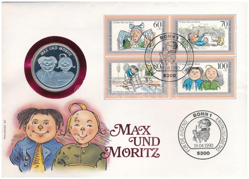Svájc 1990. "Max és Moritz" jeleztt Ag emlékérem érmés borítékban, első napi bélyegzéssel (0.999) T:PP patina Switzerland 1990. "Max und Moritz" hallmarked Ag comemmorative medallion in coin envelope with first day of issue stamp (0.999) C:PP patina
