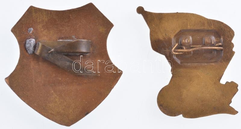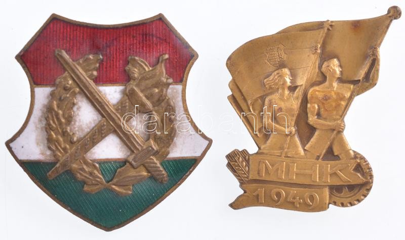Leírás: 1948. "Magyar Szabadságharcos Szövetség" zománcozott fém jelvény (33,5x32mm) + 1949. "MHK (Munkára Harcra Kész)" bronz lemezjelvény (32x29mm) T:1-,2