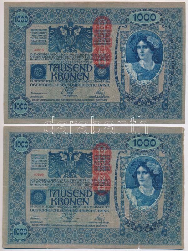 Ausztria 1919. (1902) 1000K, függőleges "DEUTSCHÖSTERREICH" felülbélyegzéssel, mindkét oldal német (2x) T:III,III-