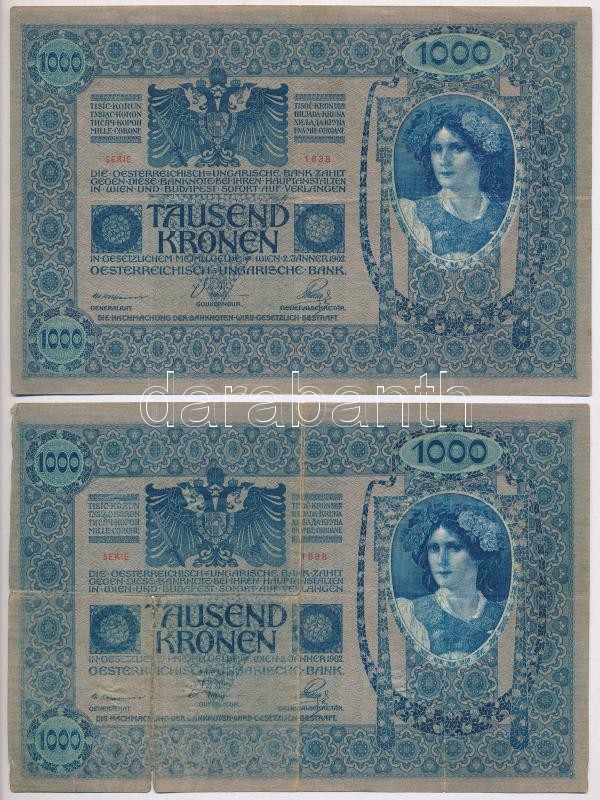 Austria 1919. (1902) 1000 Kronen, with vertical "DEUTSCHÖSTERREICH" overprint, both sides in german (2x) C:F,VG