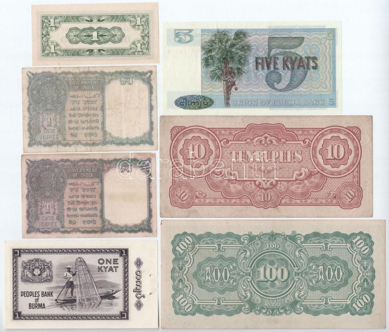 Leírás: Burma / Japán megszállás 1942-1944. 10R + 100R + Burma 1945. 1R (indiai bankjegy "Military Administration of Burma" felülbélyegzéssel) + 1947. 1R (indiai bankjegy "Burma currency board" felülbélyegzéssel) + 1965. 1K + 1973. 5K + Fülöp-szigetek / Japán megszállás 1942. 1c T:I-III