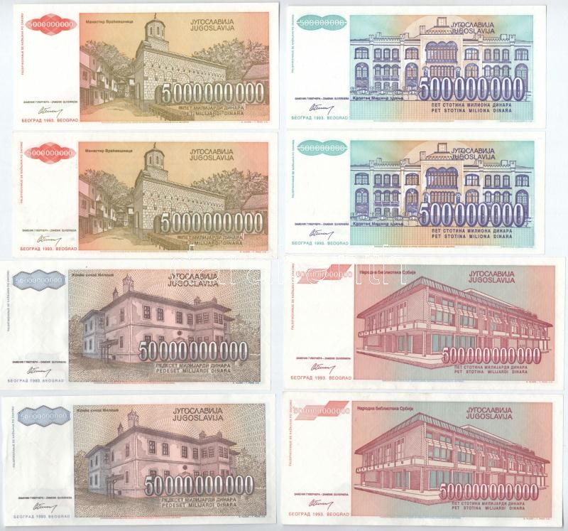 Leírás: Jugoszlávia 1993. 500.000.000D (2x) + 5.000.000.000D (2x) + 50.000.000.000D (2x) + 500.000.000.000D (2x) T:I,II