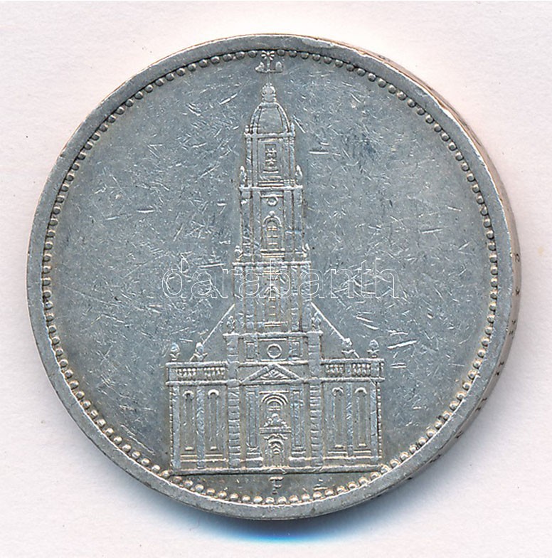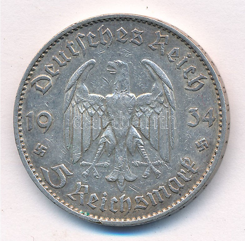 German Third Empire 1934F 5 Mark Ag "1st Anniversary of Nazi rule" C:VF small edge error