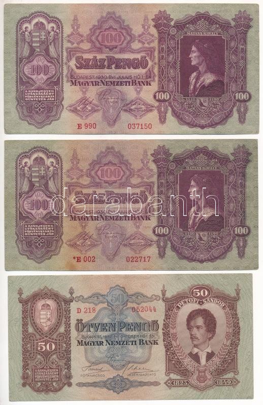 1930. 100P + 1930. 100P csillagos sorozatszám + 1932. 50P + 1936. 10P ... https://www.darabanth.com/hu/409-Gyorsarveres/409.0/Numizmatika/Magyar-bankjegyek~2500007/1930-100P-plus-1930-100P-csillagos-sorozatszam-plus-1932-50P-plus-1936-10P-plus-1939-5P-plus-1941-20P-TIII~II2523981