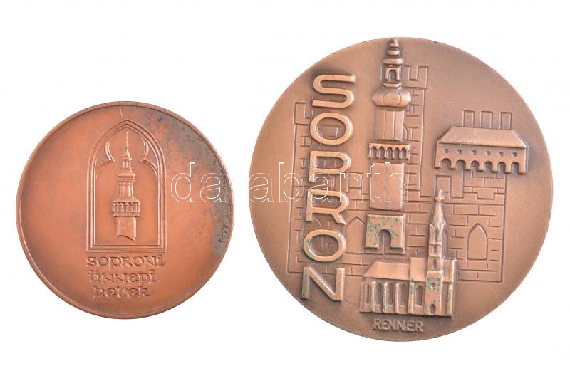 Leírás: Renner Kálmán (1927-1994) 1977. "Sopron 1277-1977" Br emlékérem (59mm) + 1987. "Sör Fesztivál Sopron / Soproni Ünnepi Hetek" Br emlékérem (42,5mm) T:1-,2 patina