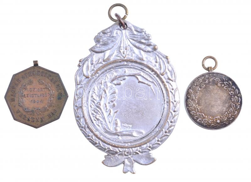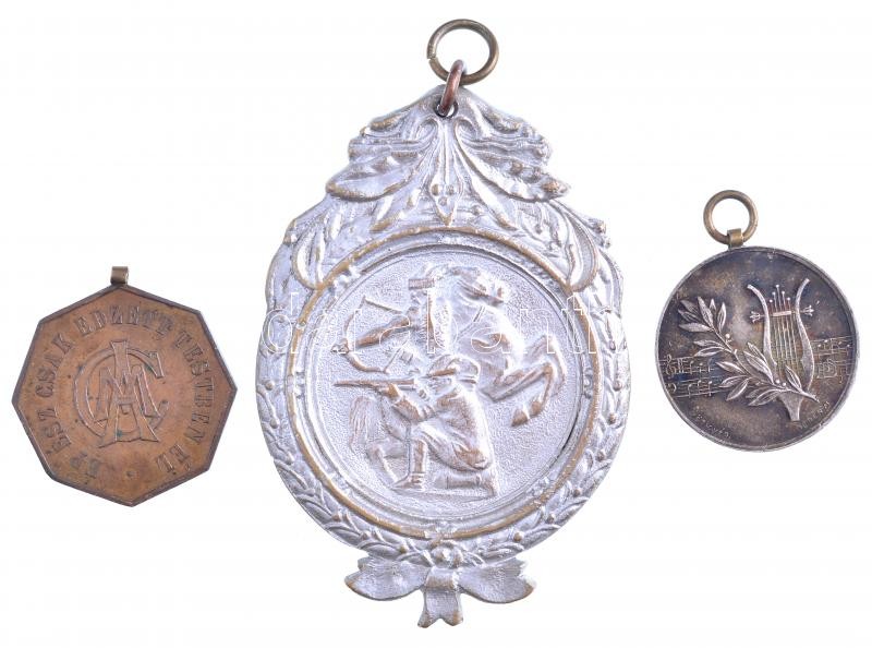 Leírás: Vegyes 3db-os sportérem tétel, benne ~1920. Ezüstözött fém lövész érem "FÜSTI ÖTVÖS" gyártói jelzéssel (78,5x54mm), 1904. "Magyar Athletikai Club - Verseny díj" bronz díjérem mellszalag nélkül (31x31mm), DN Daloskör díjérem, "BERÁN" gyártói jelzéssel T:2