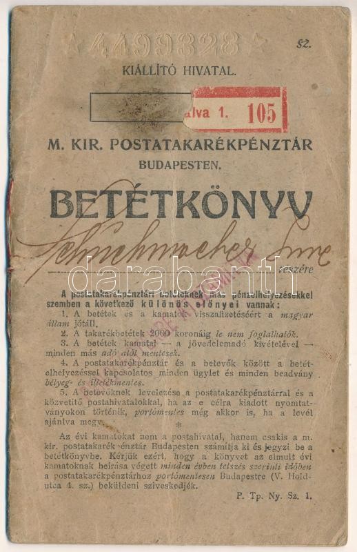 Leírás: ~1920. "M. Kir. Postatakarékpénztár Budapesten" kitöltött betétkönyv, bélyegzésekkel, kopottas állapotban