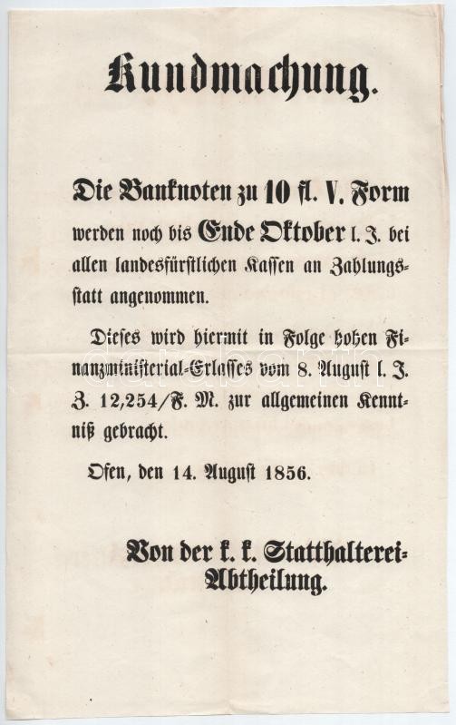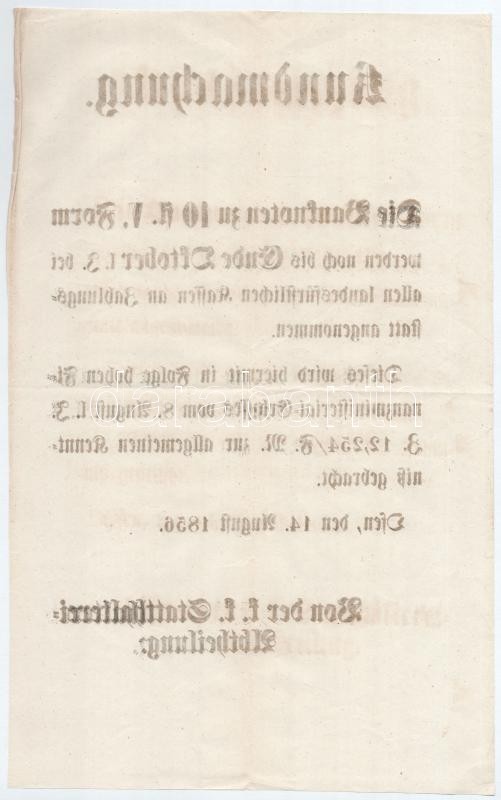 Leírás: Buda (Ofen) 1856. Hirdetmény 10 Florinos bankjegyek október végi bevonásáról, német nyelven T:III szép papír