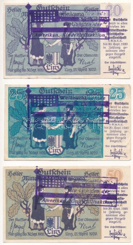 Austria / Linz 1920. 20 Heller + 25 Heller + 50 Heller all with blue "Weihnachtsspende zu Gunsten der Amerikan. Kinderhilfsaktion (Christmas donation in favor of the Americans. Children's charity)" overprint C:XF,VF
